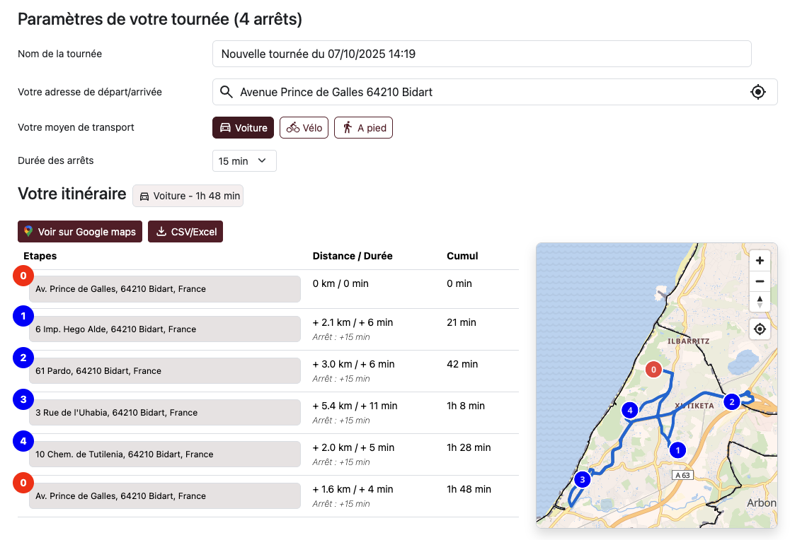 Vous avez repéré des adresses à prospecter ? Immocarto vous construit automatiquement votre tournée terrain efficace : le plus court chemin, qu'il soit à voiture, en vélo ou à pied pour aller voir vos adresses.